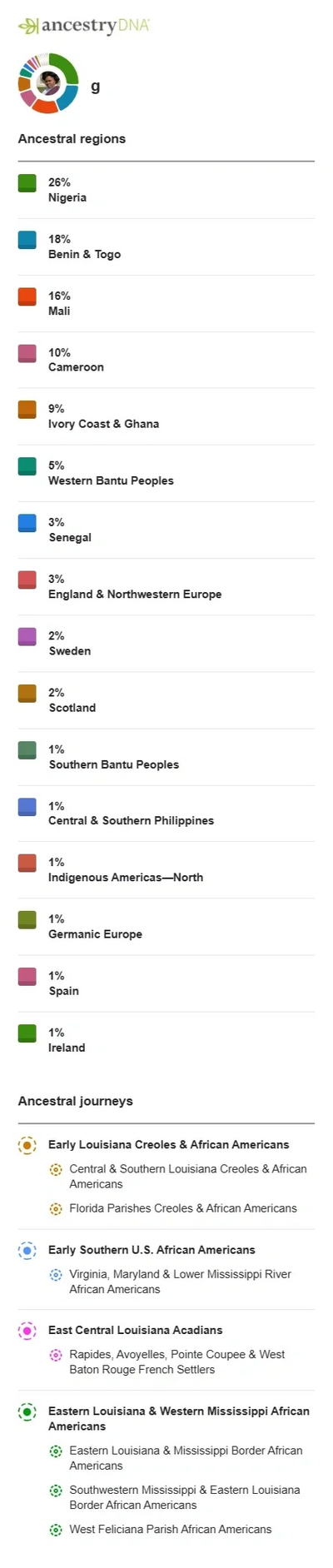 Through years of research, I’ve also traced my family roots beyond Louisiana to Maryland, Virginia, Kentucky, Alabama, Mississippi, South Carolina, and North Carolina. You can see this reflected on the ancestral journey chart (see photo).